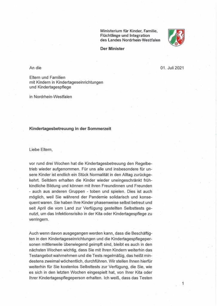 Ministerschreiben Eltern Regelbetrieb ab dem 7. Juni 2021